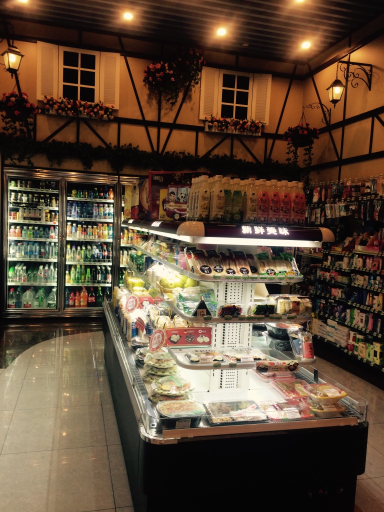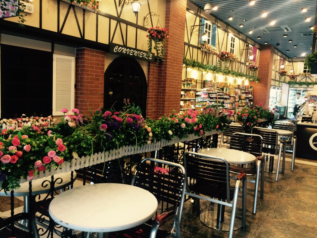 一進門沒有傳統(tǒng)便利店的貨架和商品,而是打造的歐式花園式風(fēng)格的休閑區(qū)。歐式建筑風(fēng)格加上鮮花的映襯,地中海風(fēng)格的天花板配之吊燈的照射,仿佛到了室外桃園的感覺令人心曠神怡,陶醉其中。這家店的美是毋庸置疑的,今天小編想從商品結(jié)構(gòu)、陳列等來分析這家店。