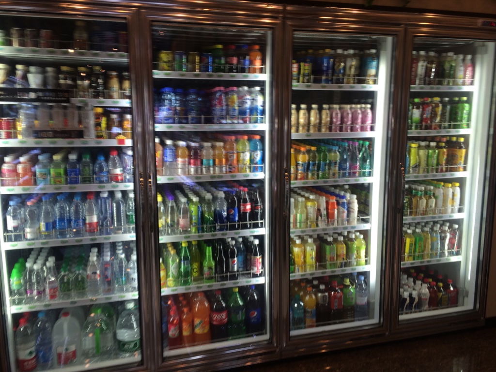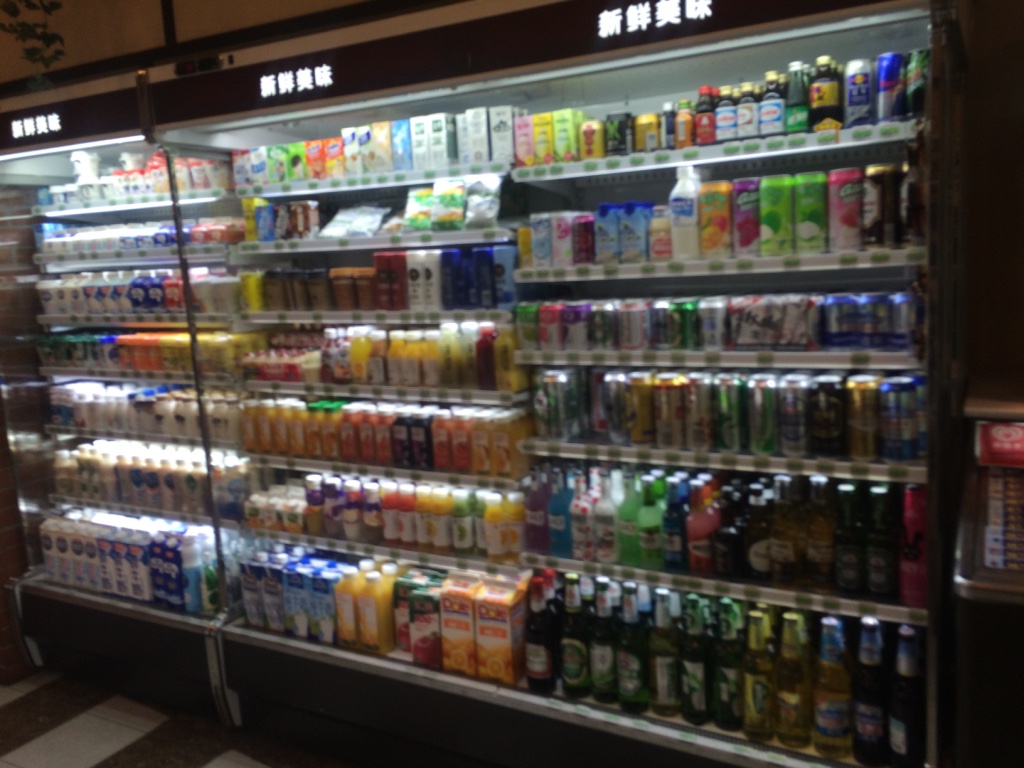一臺3尺冷藏風(fēng)幕柜,一臺6尺冷藏風(fēng)幕柜,分別陳列牛奶乳飲品、咖啡酸奶、啤酒預(yù)調(diào)酒。