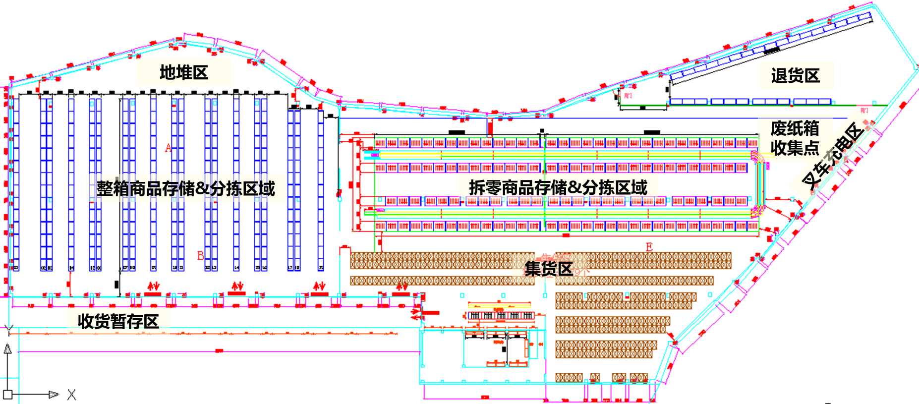 7) 輔助功能區(qū):比如叉車充電區(qū)域、托盤/周轉(zhuǎn)箱等設(shè)備存放區(qū)、廢紙箱存放區(qū)等,以及其他辦公生活區(qū)域,包括洗手間、打單室、機房、辦公室、會議室等。