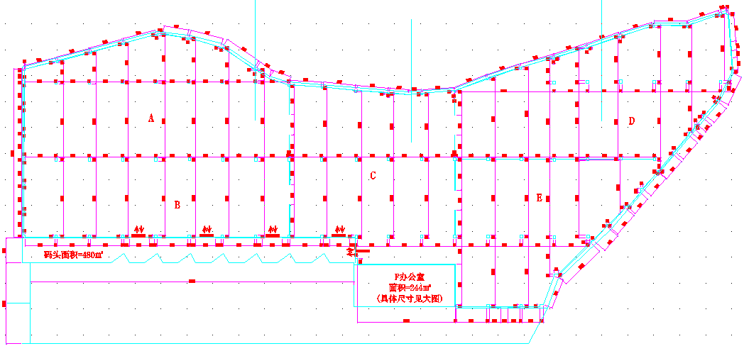 整個物流中心庫內(nèi)面積約7300平方,需滿足350家便利門店的配送,品項需求3000個,其中整箱500個,拆零2500個。倉庫形狀非常不規(guī)則,具體如下圖:
