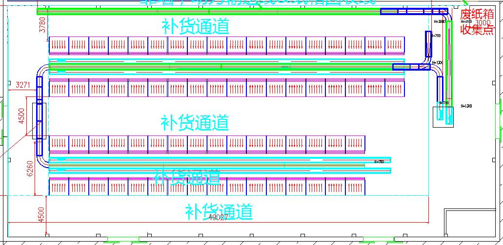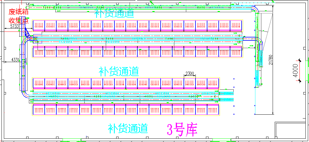 與方案一相比,方案二最大的差別是將廢紙箱收集點設(shè)計在左上角。因為方案一在廢紙箱回收傳輸帶設(shè)計上碰到困難,從倉庫整個空間來看,最上方從左向右的通道使用率最少,所以放棄從左向右的通道也可以。另一方面,3號倉拆零商品的補貨是來自于1號倉及2號倉,從右下的門進來。因此,整體的從左向右的通道使用率比較少,所以也不處理U型傳輸帶相連處了,中間通道也只能從右向左行駛?cè)缓笤偻顺鋈チ恕?/span>