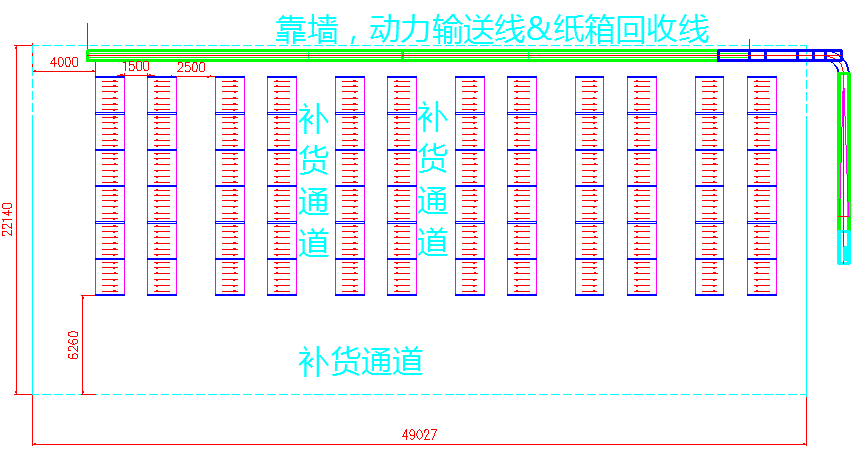 鋼平臺上方用于C類拆零揀選商品,為了控制整體的投入成本,電子標(biāo)簽采用一對五標(biāo)簽,只投入動力傳輸帶(傳輸滿箱周轉(zhuǎn)箱)和廢紙回收傳輸帶,總共1200個揀選位。鋼平臺上設(shè)置兩個活動欄桿,通過叉車將商品補貨至鋼平臺上。動力傳輸帶右側(cè)連接下坡皮帶機,周轉(zhuǎn)箱輸送至一樓進行封箱上位集貨操作。而廢紙回收傳輸帶則直接從鋼平臺上方往下掉,地面上的廢紙箱收集處用鐵絲網(wǎng)圍起來。