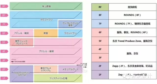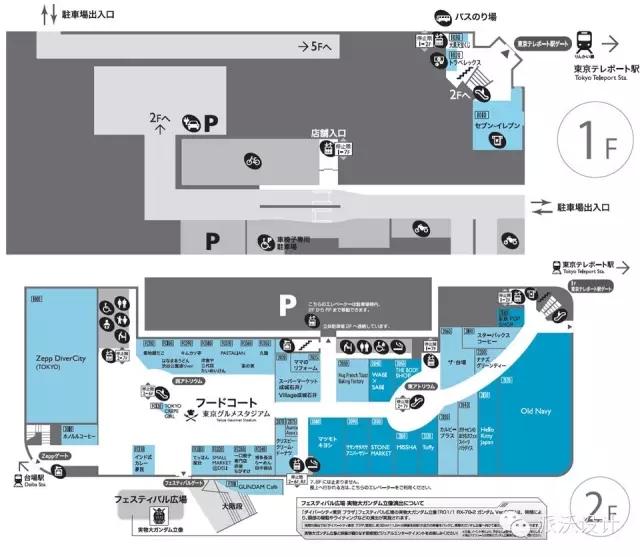 1-2F:2F的「東京美食體育場」擁有700多個座位,匯聚各式美食;該層的festival廣場上立有18米高等身高的高達立像,這是該項目的一大亮點,吸引了不少國內(nèi)外游客前往觀光。1F層設置有貨幣替換等服務設施。