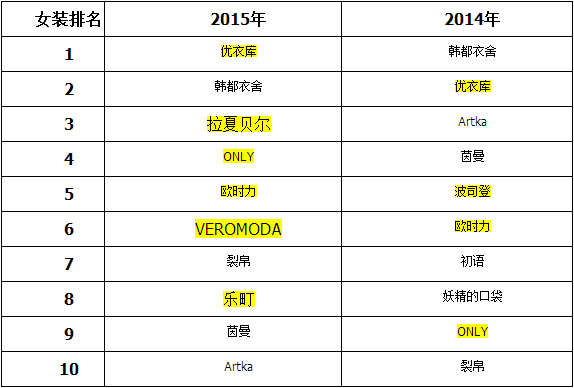 讓我們對(duì)比這2年雙11女裝十強(qiáng)排名: