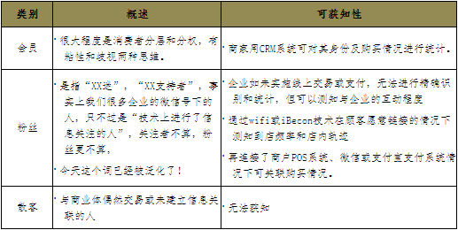 近年,隨著微信公號和iBecon技術的應用,零售業(yè)開始優(yōu)化顧客統(tǒng)計及識別技術,但會員、粉絲與散客在統(tǒng)計主體、統(tǒng)計渠道、統(tǒng)計方法及分析應用方面出現(xiàn)很多的數(shù)據(jù)錯位,由于斷點式數(shù)據(jù)采集,我們很多分析很難實現(xiàn)邏輯自洽,這也是未來大數(shù)據(jù)分析的空間!那么我們先要分清這三者的分析領域: