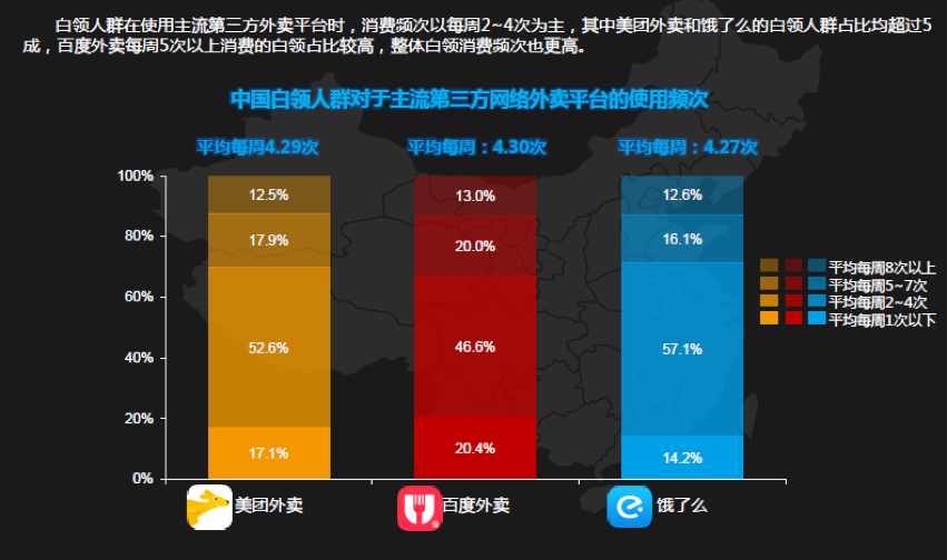白領(lǐng)群體的消費(fèi)次數(shù)每周以2-4次為主,從平均來(lái)看美團(tuán)外賣(mài)為4.29次,百度外賣(mài)為4.30次,餓了么為4.27次,彼此不分伯仲,但是從整體上來(lái)看,百度外賣(mài)的白領(lǐng)人群整體頻次更高。