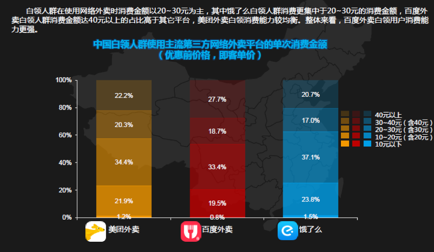 白領(lǐng)用戶有高客單價(jià)的特點(diǎn),根據(jù)DCCI報(bào)告顯示,白領(lǐng)人群的主流消費(fèi)金額在20-30元,而百度外賣(mài)的消費(fèi)價(jià)格普遍偏高,其中40元以上的占比27.7%,高于美團(tuán)外賣(mài)與餓了么。
