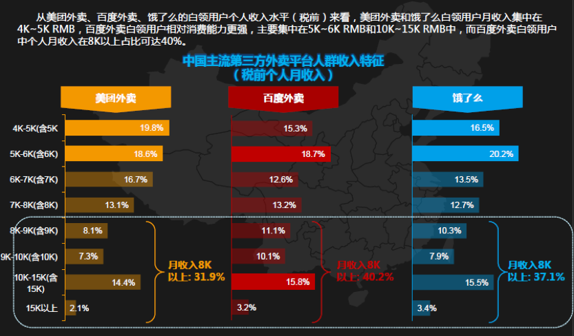 從白領(lǐng)用戶個(gè)人收入水平開(kāi)看,美團(tuán)外賣(mài)和餓了么白領(lǐng)用戶主要集中在4K-5K之間,百度外賣(mài)白領(lǐng)用戶收入主要集中在5K-6K和10K到15K之間,在8K以上的用戶占比可達(dá)40%,消費(fèi)能力也更強(qiáng)。一頓20-30元左右價(jià)格的飯對(duì)于白領(lǐng)人群來(lái)說(shuō)不會(huì)構(gòu)成太大問(wèn)題。而對(duì)于學(xué)生群體,生活費(fèi)普遍不高,因此在未來(lái),補(bǔ)貼大戰(zhàn)如果結(jié)束,回到價(jià)值經(jīng)濟(jì),白領(lǐng)市場(chǎng)所受到的影響也絕對(duì)比學(xué)生群體小。