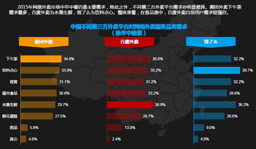以上這張圖是除了餐飲需求外的對(duì)比,在這張圖中,美團(tuán)外賣(mài)的用戶對(duì)下午茶的需求較多,百度外賣(mài)的用戶對(duì)水果生鮮要求多,餓了么的用戶對(duì)飲料點(diǎn)心的需求較多,各有不同,百度外賣(mài)白領(lǐng)用戶的整體性需求比較強(qiáng)。