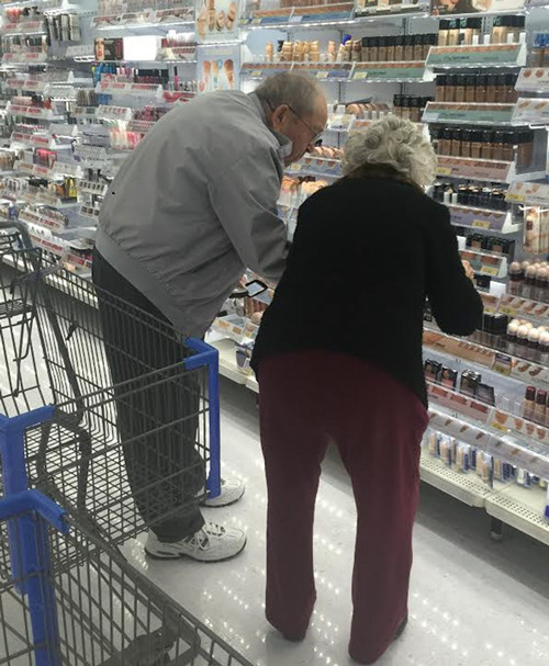 最近,社交網(wǎng)站facebook上一對(duì)白發(fā)老人在商場(chǎng)挑選化妝品的圖片感動(dòng)無數(shù)網(wǎng)友。妻子似乎不知道該選哪個(gè)色號(hào)的粉底,而丈夫彎下腰耐心幫她參謀。