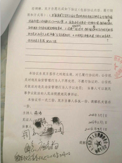 祖杏月在投訴材料中說:3月1日(與記者通完電話后),她在屈臣氏長樂路沃爾瑪超市店門口被帶到派出所,與屈臣氏簽訂了調(diào)解協(xié)議書。當(dāng)時如不簽的話,她一家人(兒子、母親)都會被拘留。為了不被拘留,在當(dāng)晚將近24:00,“……于是強(qiáng)迫我簽下了三萬元的協(xié)議!