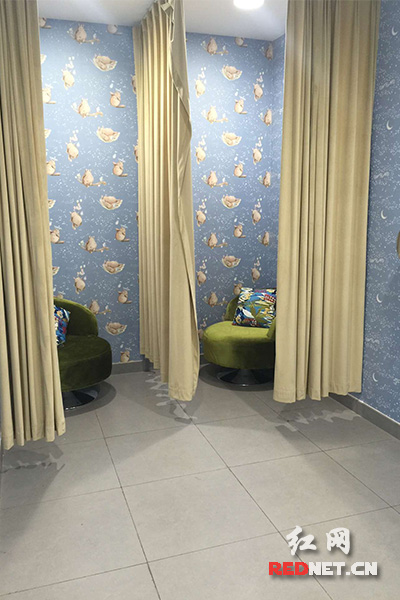 王府井河西店母嬰室的兩個單人位沙發(fā)被拉簾間隔成相對獨立的兩個哺乳空間,洗手臺還有嬰兒洗手液、嬰兒爽身粉和衛(wèi)生紙?zhí)峁?