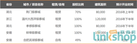 在期內(nèi),銀泰新開了2家門店,分別為蕪湖銀泰城和寧波環(huán)球銀泰城。2016年,計(jì)劃新開5家,分別為下沙銀泰工廠店(已開業(yè))、荊門銀泰城、溫州大西洋銀泰城、孝感銀泰城、蚌埠銀泰城。另外,合肥濱湖銀泰城開業(yè)時間待定。