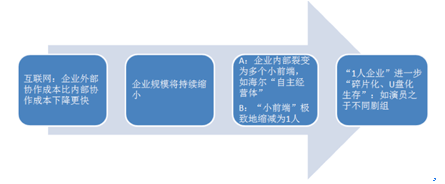 在這一過(guò)程中,小前端在持續(xù)地走向小微化,乃至個(gè)人化。工業(yè)時(shí)代占據(jù)主導(dǎo)地位的是“大批量、小品種”的規(guī)模經(jīng)濟(jì),與之相應(yīng),組織也在持續(xù)走向極大化。1929年,資產(chǎn)達(dá)10億美元以上的美國(guó)巨型企業(yè)已有約65家,到1988年這一數(shù)字增至了466家。再如今天的沃爾瑪,它在全球的雇員已經(jīng)超過(guò)了200多萬(wàn)人!到了DT時(shí)代,盡管大型組織仍將是組織領(lǐng)域里的圖景之一,但隨著“多品種、小批量”的范圍經(jīng)濟(jì)正在很多個(gè)行業(yè)里取得越來(lái)越主導(dǎo)的地位,與之相應(yīng)的組織規(guī)模,相應(yīng)地也在逐步走向小微化、個(gè)人化。