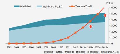 2013年,作為DT時(shí)代新經(jīng)濟(jì)、新治理這一領(lǐng)域里的一家企業(yè)智庫(kù),阿里研究院在《新基礎(chǔ):消費(fèi)品流通之互聯(lián)網(wǎng)轉(zhuǎn)型》報(bào)告中曾做過(guò)如下預(yù)測(cè):“以阿里巴巴集團(tuán)網(wǎng)絡(luò)零售平臺(tái)為例,保守估計(jì)其銷售額將在2014年超越沃爾瑪在美國(guó)的銷售額,將在2016年超越沃爾瑪全球成為全球零售之冠!