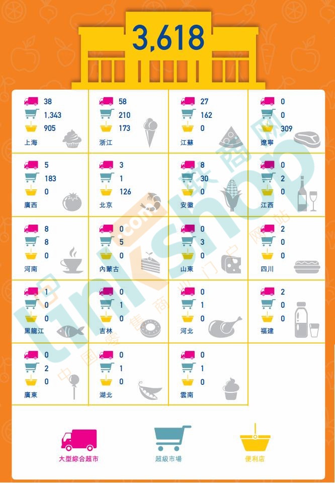 聯(lián)華超市:2016年新開門店212家,關(guān)閉477家(395家為加盟店)。其中,大型綜合超市業(yè)態(tài)新開1家,關(guān)閉6家;超級市場業(yè)態(tài)新開120家,其中直營門店10家,加盟門店110家;便利業(yè)態(tài)新開91家,其中直營門店35家,加盟門店56家。2016年新開門店總面積55924平方米。截止2016年12月31日,門店總數(shù)3618家,約81.73%的門店位于華東地區(qū)。