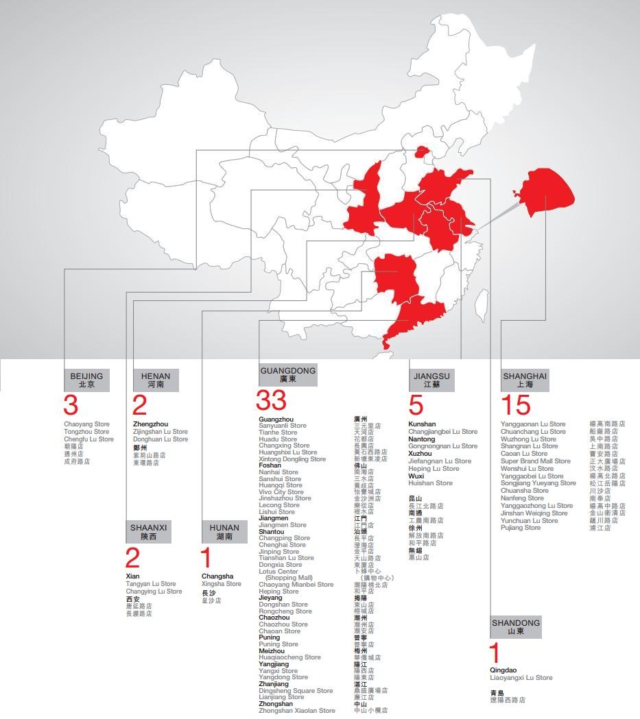 1997年6月23日卜蜂蓮花第一家大賣場在上海浦東楊高南路店開出。截至2016年12月31日的卜蜂蓮花已經在中國擁有61家大賣場和1家購物中心,卜蜂蓮花門店分布于廣東、上海、江蘇、北京、河南、陜西、湖南、山東等8個省市,總經營面積近52萬平方米。但卜蜂蓮花在華發(fā)展速度明顯落后于沃爾瑪家樂福等外資零售。