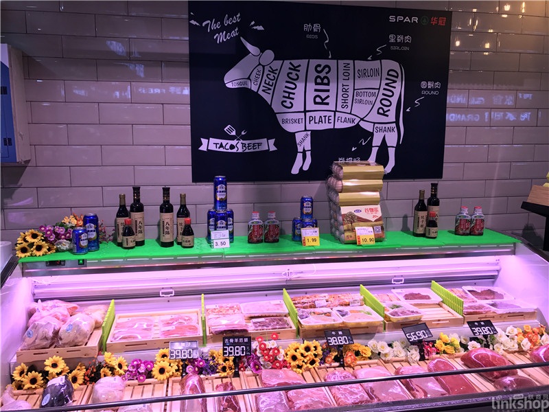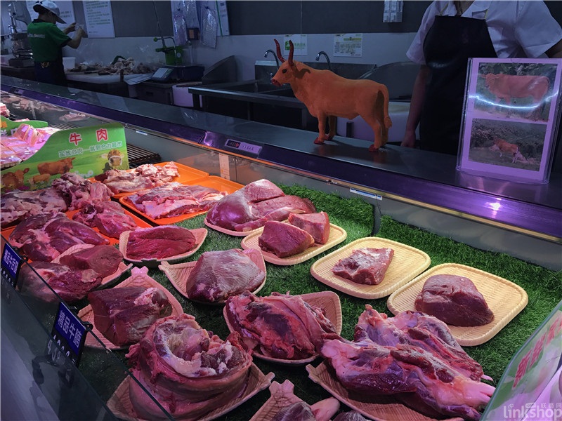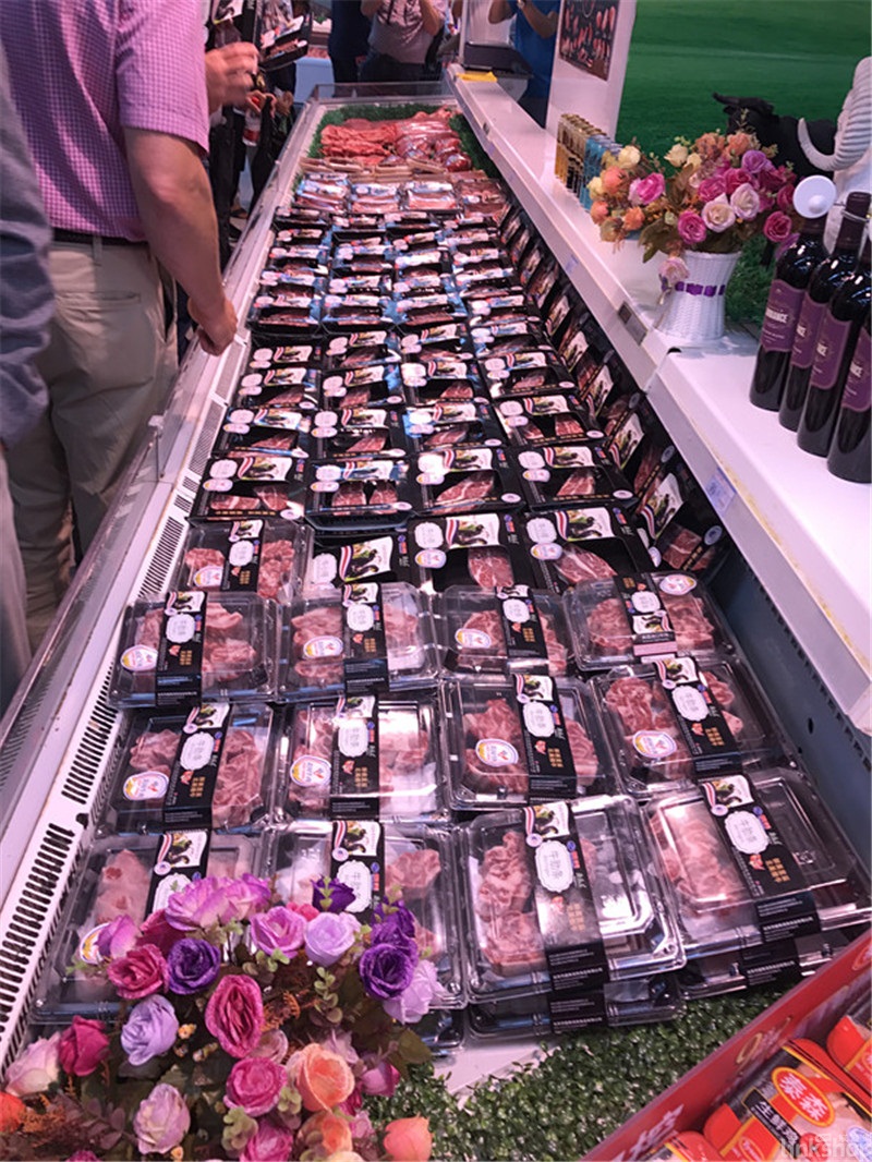 ▲而在7月26日開業(yè)的龍華山姆會(huì)員店,從美國(guó)進(jìn)口的牛肉陳列在透明玻璃柜中,底部由塑料紙隔著的冰臺(tái),周邊加上雕刻后的彩椒裝飾。這種陳列模式從衛(wèi)生角度考慮俱佳,但是亮感展示不夠。