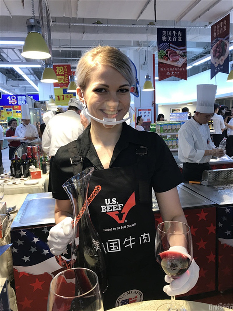 ▲7月26日物美在北京啟動(dòng)美國(guó)牛肉直采儀式,在門店牛肉的陳列更具國(guó)際范,每一個(gè)牛肉單品都是經(jīng)過精包裝,旁邊的美國(guó)大廚現(xiàn)場(chǎng)烹制牛肉,加上紅酒的點(diǎn)綴可謂是美女美酒美味。