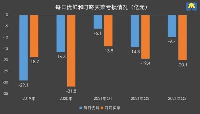 近日,每日優(yōu)鮮和叮咚買菜先后發(fā)布2021年第三季度財報,情況不容樂觀。從2019年到該季度為止,每日優(yōu)鮮累計虧損近76億,叮咚買菜累計虧損近104億。
