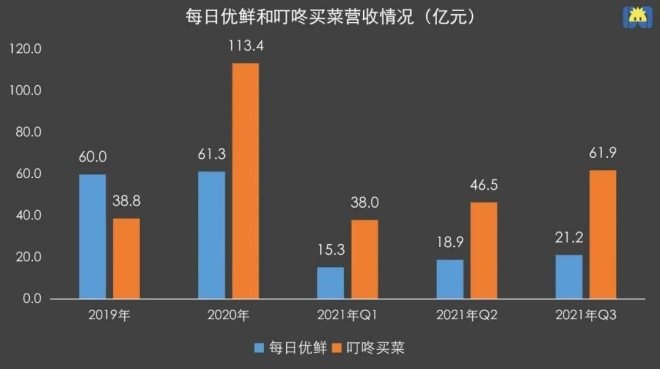 生鮮前置倉仍是個燒錢的業(yè)務(wù)。2021年第三季度財報顯示,叮咚買菜和每日優(yōu)鮮兩家分別虧損9.7億、20.1億,虧損幅度并沒有明顯減小。