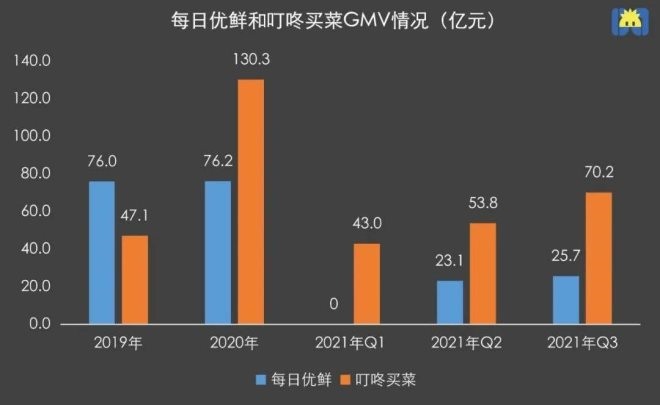 GMV方面,每日優(yōu)鮮在2019-2020年的GMV增長近乎“原地踏步”。而叮咚買菜2020年的GMV幾乎是它的兩倍,這種態(tài)勢延續(xù)到了今年的二季度和三季度。