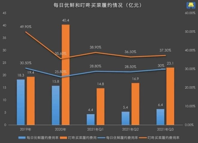 復(fù)購率方面,每日優(yōu)鮮在三季度財報提到付費會員貢獻的收入,同比增長800%,證明其復(fù)購率有一定提高。而這方面,叮咚買菜沒能拿出相應(yīng)的數(shù)據(jù)支撐。