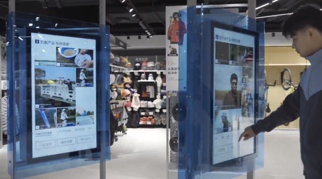 1600平米的門店內,分布設有22塊觸摸屏,無論你身在哪個展區(qū),都可以通過線上了解更多的運動產品細節(jié),還可以進行店內導覽、服務探索等,黑科技交互帶來沉浸式購物體驗。
