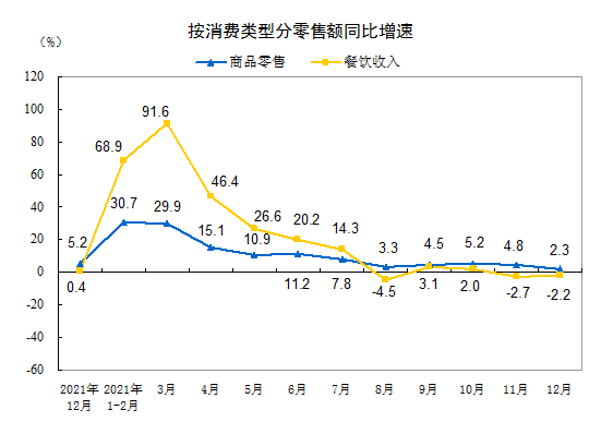 按消費類型分,2021年商品零售393928億元,比上年增長11.8%;餐飲收入46895億元,增長18.6%。12月份商品零售36428億元,同比增長2.3%;餐飲收入4841億元,下降2.2%。