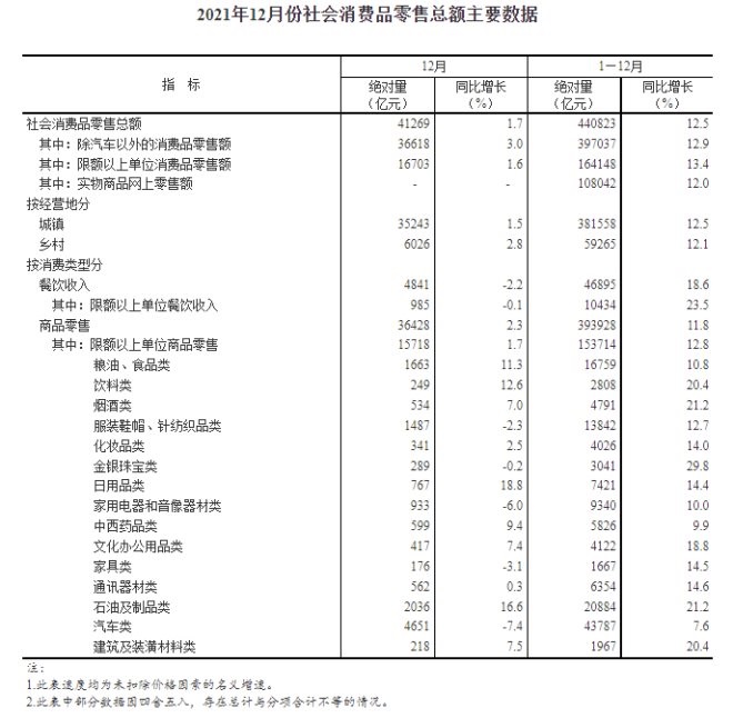 2021年12月份,社會消費品零售總額41269億元,同比增長1.7%。其中,除汽車以外的消費品零售額36618億元,增長3.0%。