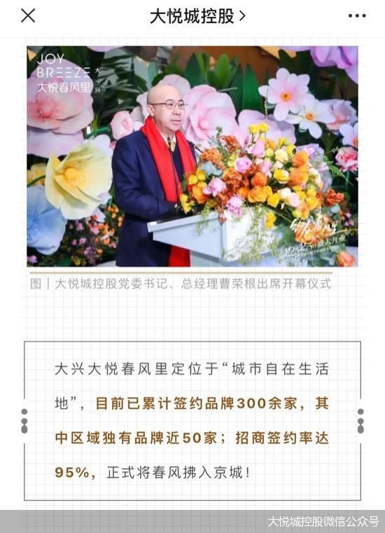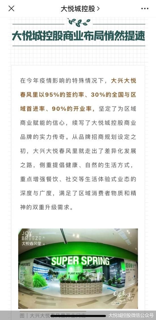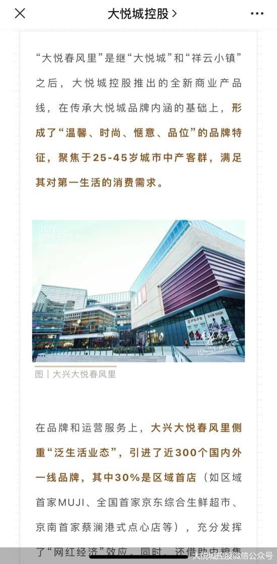 根據(jù)大悅城控股在大興大悅春風(fēng)里開業(yè)時(shí)在官方微信公眾號上發(fā)布的內(nèi)容顯示,“大悅春風(fēng)里”是繼“大悅城”和“祥云小鎮(zhèn)”之后,大悅城控股推出的全新商業(yè)產(chǎn)品線。大興大悅春風(fēng)里還是“大悅春風(fēng)里”首作。