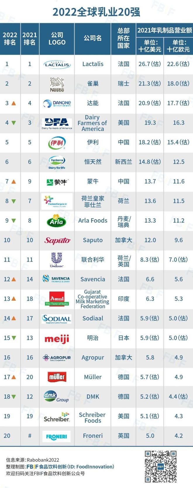 荷蘭合作銀行(RABO BANK NEDERL-ANDS)公布2022年全球乳業(yè)20強(qiáng)榜單。該機(jī)構(gòu)依據(jù)乳制品企業(yè)2021年業(yè)績(jī)發(fā)布的全球乳業(yè)20強(qiáng)排行榜,為目前全球乳業(yè)最權(quán)威的排行榜單之一。