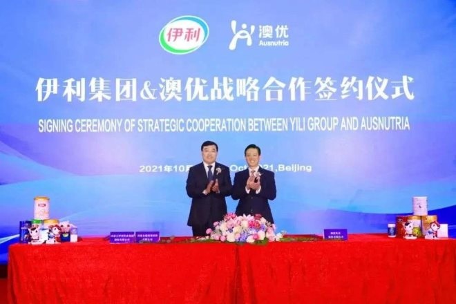 圖片來源:澳優(yōu)官方微信公眾號(hào) 伊利集團(tuán)董事長(zhǎng)兼總裁潘剛(左)、澳優(yōu)董事長(zhǎng)顏衛(wèi)彬(右)合影