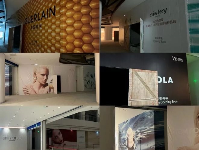 從目前整個商場一樓的品牌圍擋看,高化美妝陣容位于北側(cè),北側(cè)通道主要以名表為主,圍繞著大中庭以一線品牌為主,南側(cè)主要為輕奢,除了上述品牌以外,還有更多大牌圍擋也將陸續(xù)上新。