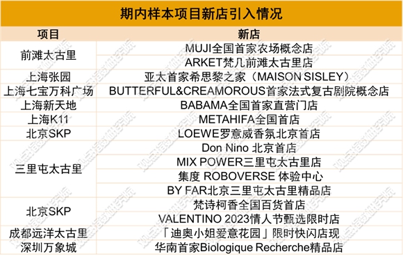 期內(nèi),觀點(diǎn)指數(shù)觀察下的樣本項(xiàng)目新店引入上趨于多元化,具有較強(qiáng)的創(chuàng)新性。除香氛、護(hù)膚等零售業(yè)態(tài)首店外,農(nóng)場(chǎng)概念店、限時(shí)快閃店等也有所涉及。其中,北京三里屯太古里繼續(xù)發(fā)揮其在招商引入上的優(yōu)勢(shì),成為期內(nèi)引入新店最多的樣本項(xiàng)目。