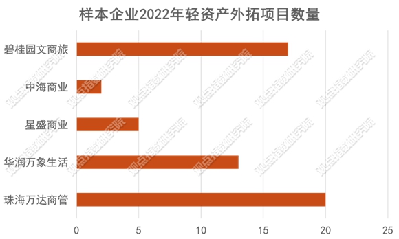 據(jù)觀點(diǎn)指數(shù)統(tǒng)計(jì),2022年珠海萬(wàn)達(dá)商管、碧桂園文商旅及華潤(rùn)萬(wàn)象生活等在第三方外拓市場(chǎng)上有較為積極的表現(xiàn),獲取了數(shù)量可觀的項(xiàng)目運(yùn)營(yíng)權(quán)。如華潤(rùn)萬(wàn)象生活2022年新簽13個(gè)輕資產(chǎn)商業(yè)項(xiàng)目,覆蓋了華北、華西等區(qū)域。