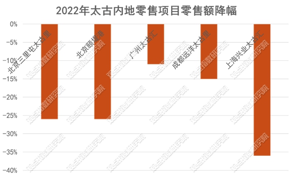 在此背景下,即使王牌項(xiàng)目也同樣難以在疫情下錄得業(yè)績(jī)?cè)鲩L(zhǎng)。如太古旗下5個(gè)成熟零售商業(yè)項(xiàng)目去年均錄得零售額同比下滑,其中最大下降幅度達(dá)到36%,最少也有10%,主要是疫情期間的閉店以及人手不足導(dǎo)致。而九龍倉(cāng)內(nèi)地重要項(xiàng)目成都IFS,雖未披露具體租金及同比情況,但業(yè)績(jī)會(huì)上披露營(yíng)業(yè)額和租金均受到拖累。