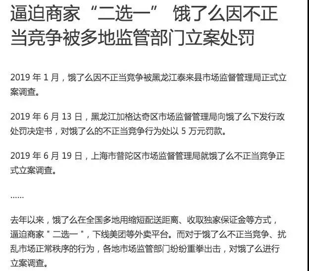 最有意思的一件事情是,我們在找有關(guān)美團(tuán)如何利用壟斷優(yōu)勢打壓餓了么的時候,找到了相反的直接監(jiān)管部門證據(jù),都是今年發(fā)生的事情。