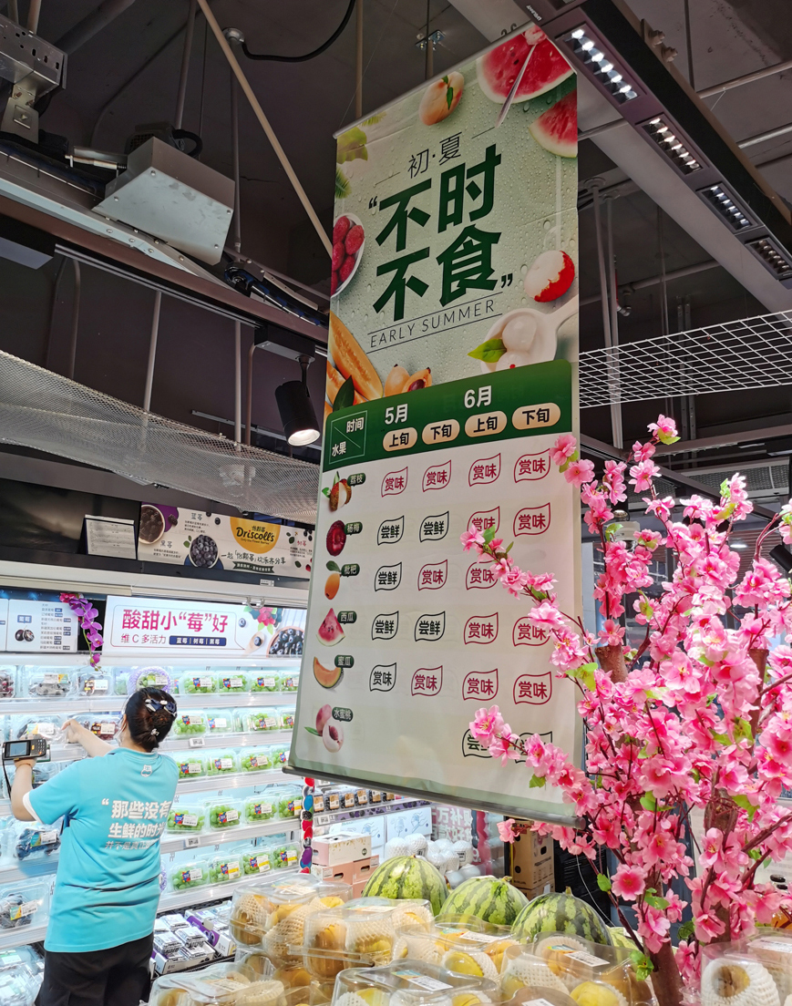 對比一下盒馬和胖東來的吊旗吊牌組合: