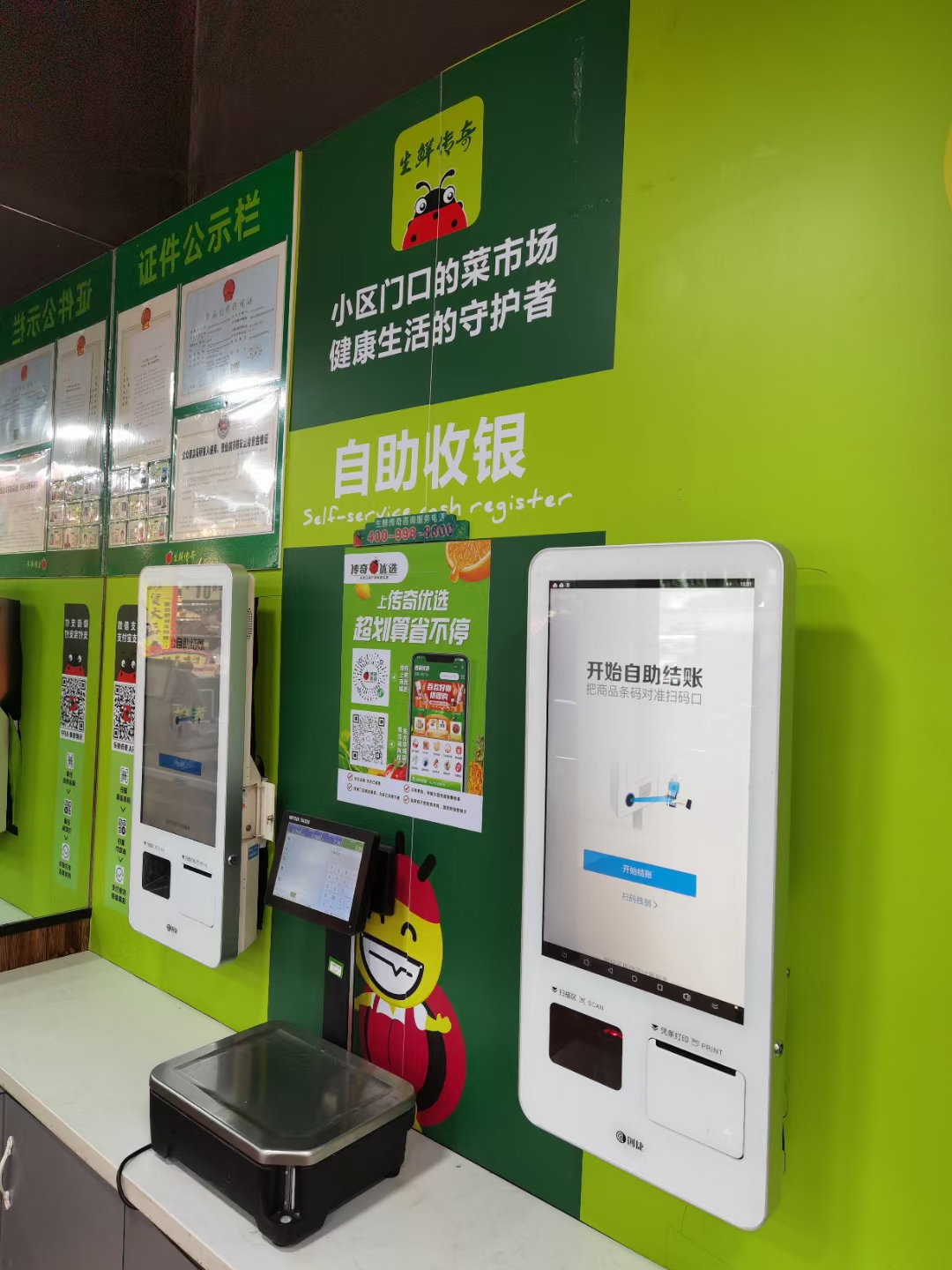 生鮮傳奇用一體機(jī)已經(jīng)很多年了,現(xiàn)在還組合了自助結(jié)賬機(jī),例如下面這種: