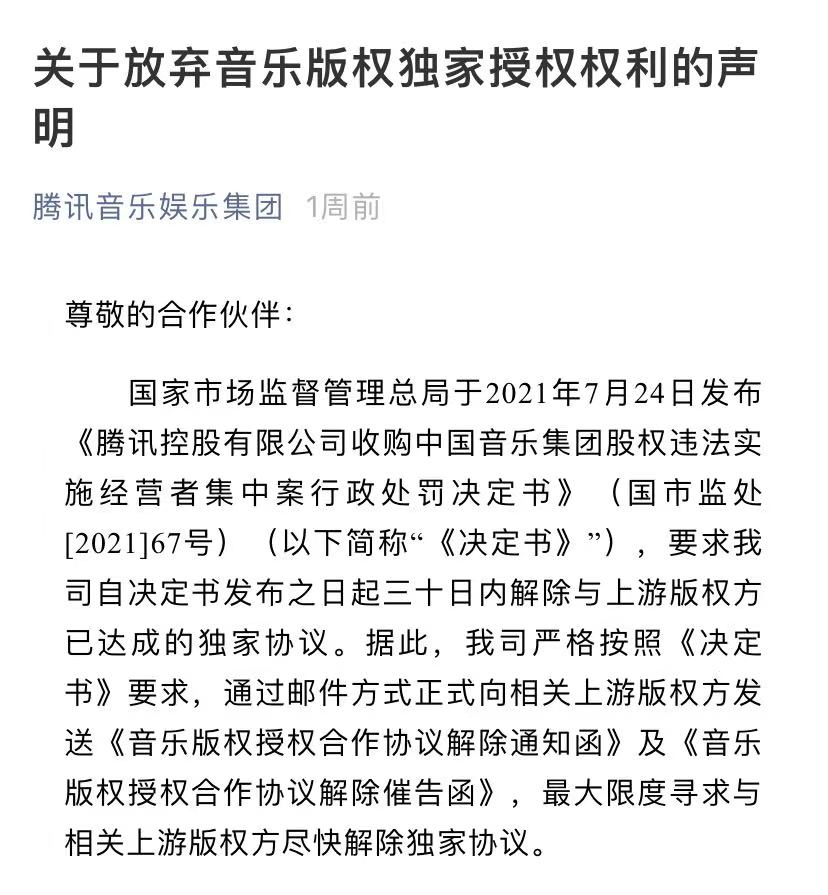 7月24日,國家市場監(jiān)督管理總局對騰訊發(fā)布處罰決定書,責(zé)令其限時(shí)30天內(nèi)解除網(wǎng)絡(luò)獨(dú)家版權(quán),停止高額預(yù)付金等版權(quán)費(fèi)用支付方式。8月31日,騰訊發(fā)布聲明稱,已向全部上游版權(quán)方發(fā)送相關(guān)函件,其中絕大部分獨(dú)家協(xié)議已按期解約。9月3日,網(wǎng)易云音樂也取消了音樂的“獨(dú)家”標(biāo)識(shí)。