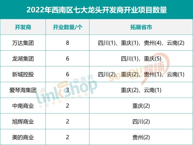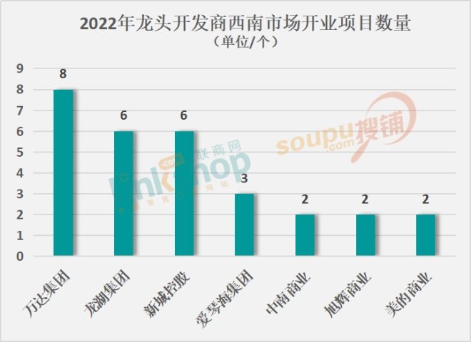 對(duì)2022年西南區(qū)七大龍頭開(kāi)發(fā)商開(kāi)業(yè)項(xiàng)目數(shù)量進(jìn)行統(tǒng)計(jì)可以看到,萬(wàn)達(dá)一騎絕塵,以8座新萬(wàn)達(dá)廣場(chǎng)的開(kāi)業(yè)量問(wèn)鼎2022年西南市場(chǎng)新項(xiàng)目數(shù)量之最。其次是龍湖集團(tuán)和新城控股,明年均將在西南開(kāi)出6座全新商業(yè)體。此外,愛(ài)琴海集團(tuán)、中南商業(yè)、美的商業(yè)、旭輝商業(yè)也分別至少有2座新項(xiàng)目入市。