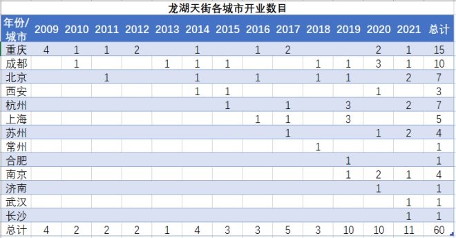 天街總體擴(kuò)張呈現(xiàn)出單城多項(xiàng)目向多城擴(kuò)張的趨勢(shì)。截至到2021年底,龍湖共開業(yè)60個(gè)天街,2021中報(bào)顯示儲(chǔ)備2022后開業(yè)的天街有18個(gè)。