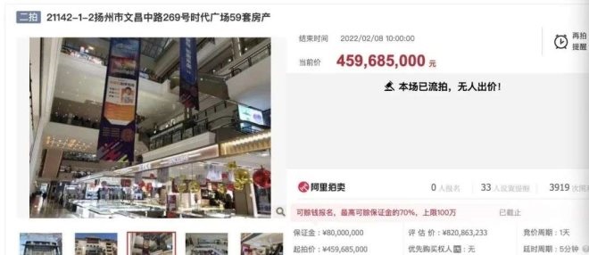 2021年12月8日,據(jù)阿里司法拍賣網(wǎng)公告,揚(yáng)州市文昌中路269號(hào)時(shí)代廣場(chǎng)59套房產(chǎn)即將拍賣,起拍總價(jià)高達(dá)5.746億元,但最終僅吸引了5838次圍觀,無(wú)人出價(jià)下,59套房產(chǎn)慘遭流拍。