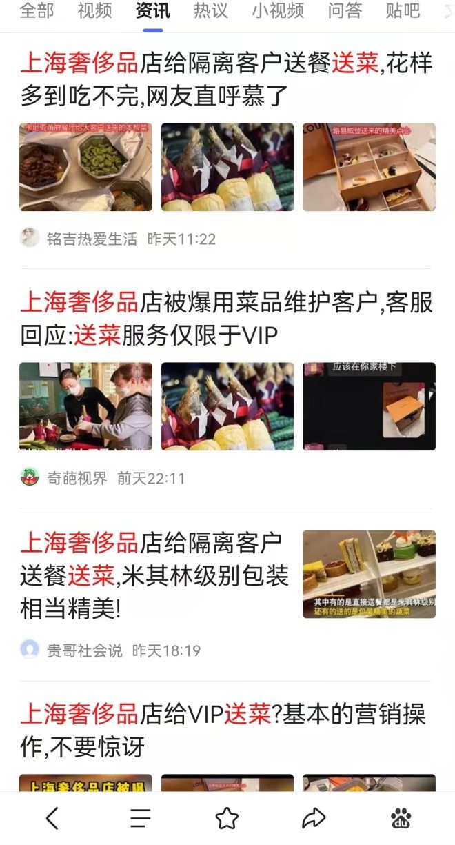 此時(shí)此刻的上海,“送菜”就是一種身份象征與最vip的服務(wù),而這恰恰符合了“奢侈品客群的消費(fèi)心理”——身份與地位的象征及一般人不能獲取的特權(quán)。所以,上海奢侈品店的此輪操作可謂“雪中送炭、四兩撥千斤”。