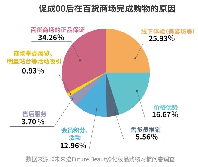被問(wèn)到“最終促成你在百貨完成購(gòu)買(mǎi)的原因”,有26%的00后調(diào)查者認(rèn)為是百貨商場(chǎng)的高端美容坊等線(xiàn)下服務(wù),另34%認(rèn)為百貨商場(chǎng)的正品保證讓人安心,而“價(jià)格優(yōu)勢(shì)”、“會(huì)員積分”、“商場(chǎng)展覽、明星站臺(tái)等活動(dòng)吸引”則沒(méi)太多吸引力。