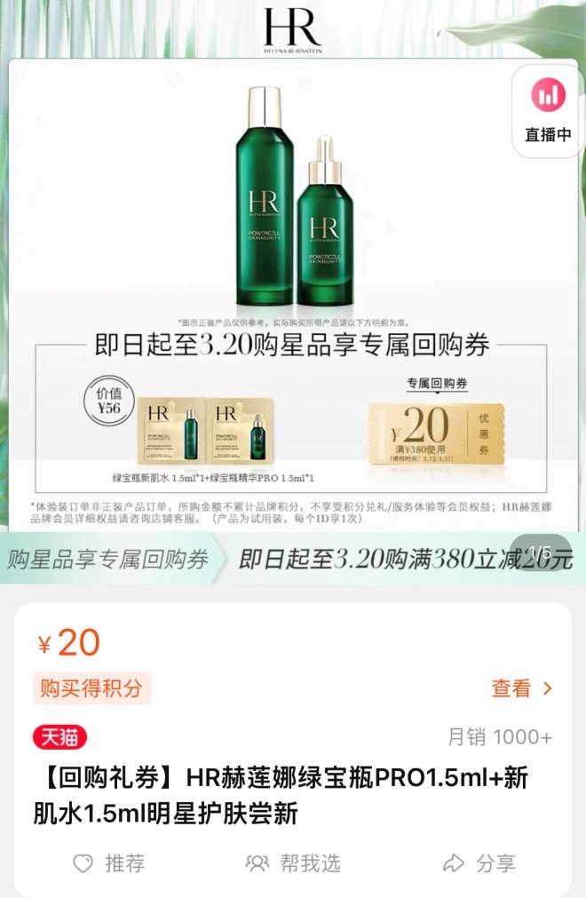 首先,試用裝問(wèn)題。目前在天貓旗艦店,幾乎所有高端化妝品牌都推出“小樣派送”服務(wù)以吸引新粉。比如在赫蓮娜天貓旗艦店,年輕消費(fèi)者們僅需一鍵加入品牌會(huì)員,預(yù)付20元,就能得到一份共3ml的赫蓮娜綠寶瓶精華和同系列新肌水,以及一份價(jià)值20元的滿(mǎn)減優(yōu)惠券,在后續(xù)購(gòu)買(mǎi)中可以使用。
