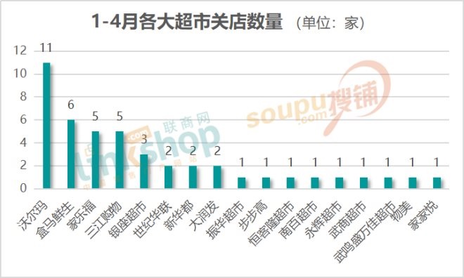 在2022年不足4個月里,已經(jīng)有45家超市閉店。其中沃爾瑪關(guān)店數(shù)量最多,閉店11家,占比約24%,其次是盒馬鮮生6家,占比約13%,家樂福和三江購物分別關(guān)店5家,占比均約11%。