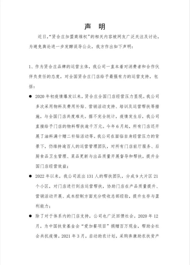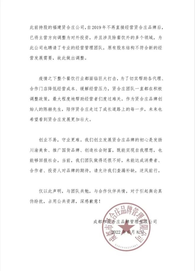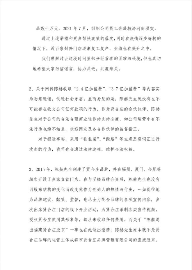 此外,賢合莊方面指出網(wǎng)傳陳赫收取“2.4億加盟費”、“3.7億加盟費”等內(nèi)容失實,為惡意造謠,制造社會矛盾。澄清表示陳赫并不是賢合莊品牌的運營主體成都市賢合莊品牌管理有限公司的直接股東,其沒有也不存在收支公司任何款項的行為,并表示如公司運營中有不法行為絕不姑息。