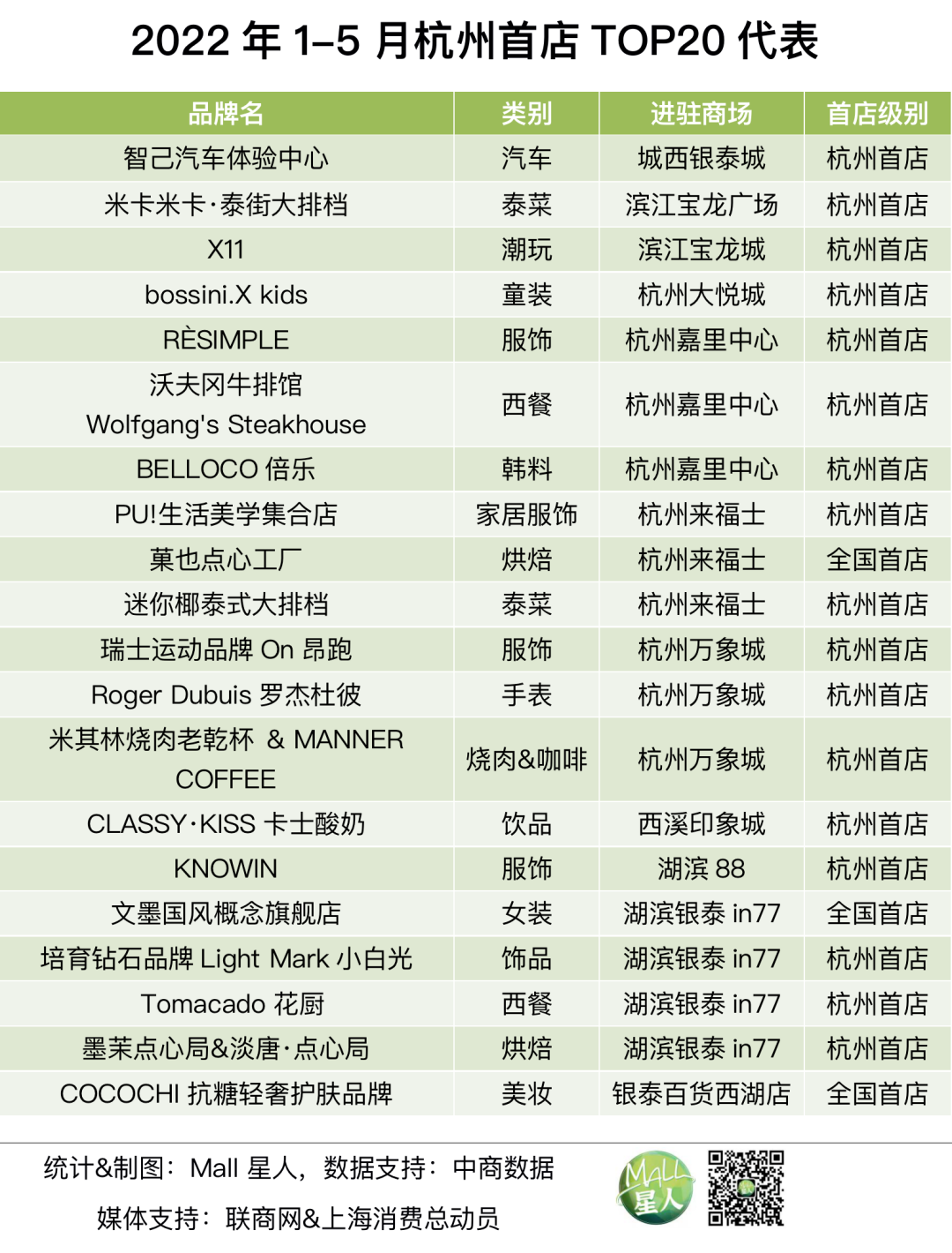 美國彩妝品牌Hourglass中國內(nèi)地首店-銀泰百貨武林店;珮姐老火鍋杭州首店-杭州湖濱銀泰in77;侯師傅熱炒(湘菜)杭州首店-杭州湖濱銀泰in77;小眾潮流設(shè)計師品牌SMFK浙江首店-杭州湖濱銀泰in77;寵物主題街區(qū)“寵這里”全球首店-杭州高德置地廣場;MORRSAN茉彡杭州首店-杭州濱江寶龍城;T9杭州首店-杭州萬象城;時尚品牌Allbirds浙江首店-杭州萬象城;虎頭局渣打餅行浙江首店-杭州萬象城;DJS女裝杭州首店-杭州大悅城;KIRSH中國首店-南京德基廣場;等等。